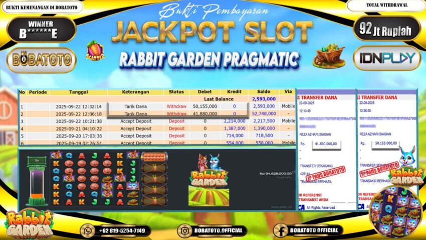 BOBATOTO – Selamat kepada User id : B*****E Telah berhasil mendapatkan kemenangan besar pada permainan  SLOT PRAGMATIC RABBIT GARDEN  Dengan kemenangan Sebesar Rp.92,000,000,-. Setelah mengisi formulir withdraw dengan kurung waktu hanya 5 – 10 menit pihak bobatoto sudah melakukan transfer kepada pemilik Userid dan dana sudah dapat di cairkan oleh pemenang. Bukti pembayaran yang kami berikan merupakan bukti pembayaran yang SAH / VALID yang langung di dapatkan melaui tanda transfer transaksi dari Bank yang di tuju.